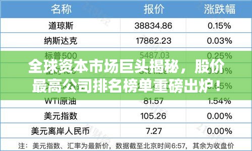随着全球经济的不断发展和资本市场的日益繁荣,各大公司的股价成为了人们关注的焦点,在这篇文章中,我们将探讨全球股价最高的公司排名,揭示这些巨头如何在资本市场中崭露头角。