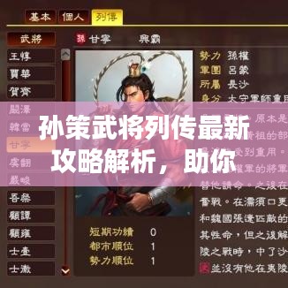 孙策作为游戏中的重要武将,具有强大的战斗力和独特的技能组合,玩家需关注游戏动态,了解最新攻略和玩法,以便更好地发展孙策,通过合理的装备选择、阵容搭配、技能升级和战斗策略,提升孙策的战斗力,成为游戏中的强者,希望本攻略能对广大玩家有所帮助,祝大家游戏愉快!