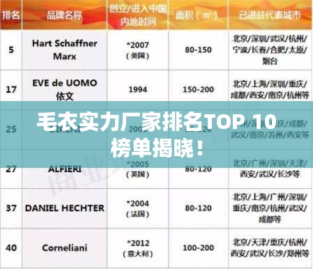 随着时尚产业的蓬勃发展,毛衣作为秋冬季节的必备单品,其市场需求日益旺盛,市场上涌现出众多毛衣生产厂家,其中实力强劲的厂家更是以其优质的产品、精湛的工艺及良好的口碑赢得了消费者的青睐,本文为您介绍毛衣实力厂家排名前十名,让您在选购毛衣时更加得心应手。