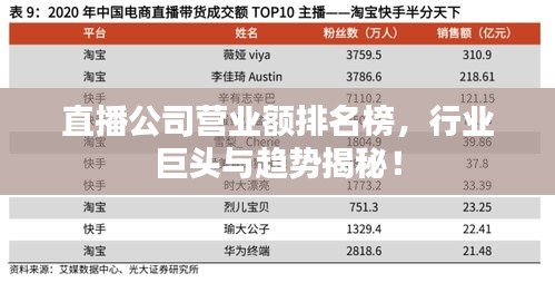 随着互联网的快速发展,直播行业逐渐崭露头角,成为当下最热门的产业之一,众多直播公司如雨后春笋般涌现,竞争愈发激烈,在这样的背景下,本文将为您呈现直播公司营业额排名榜,揭示行业巨头与趋势走向。