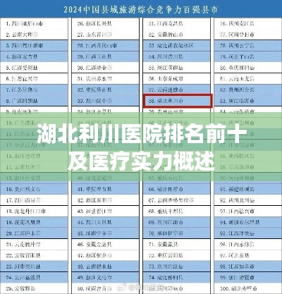 在湖北省利川市,医疗服务的发展逐渐受到社会各界的关注,本文将介绍湖北利川医院排名前十名,以便患者更好地了解当地医疗服务水平,选择合适的医疗机构。