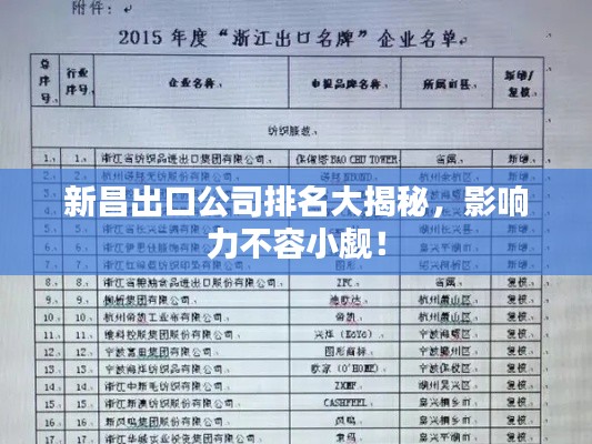 新昌县,以其独特的地理位置和繁荣的工业体系,成为浙江省乃至全国重要的经济枢纽之一,近年来,随着国际贸易的不断发展,新昌的出口业务也取得了显著的成绩,本文将探讨新昌出口公司的排名及其影响力,揭示这些企业在国内外市场的地位和作用。