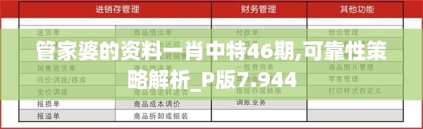 “管家婆资料一肖中特46期,可靠性策略解析_P版7.944”中的7.944版本,表明这一份资料的准确性和时效性均达到了特定标准。在澳门特區,确保数据的实时更新和可靠性至关重要,因此,每一个版本的“管家婆资料”都强调了其数据更新的及时性,确保决策者能够得到最新且准确的信息。