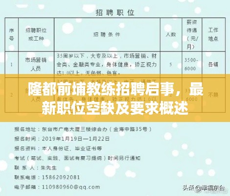 随着体育事业的蓬勃发展,隆都前埔作为本地区知名的体育培训和竞技平台,一直在寻求优秀的教练人才,本文将围绕“隆都前埔教练招聘信息最新”这一主题,为您详细介绍该机构教练岗位的相关内容。