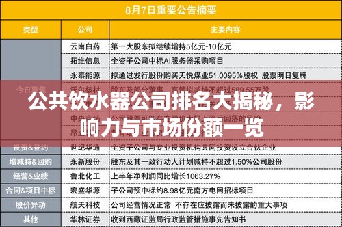 随着人们对健康生活的追求和对饮用水质量的关注,公共饮水器市场逐渐壮大,众多供应公共饮水器的公司纷纷涌现,它们以其优质的产品和服务赢得了市场的认可,本文将针对供应公共饮水器公司的排名及其影响力进行探讨。