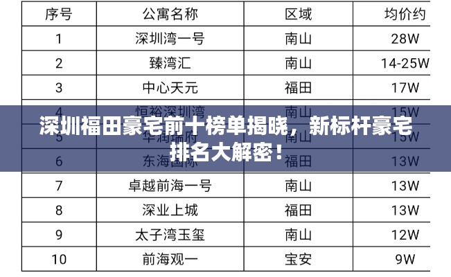 在深圳这座繁华都市中,福田区的豪宅项目一直备受瞩目,本文将为您揭晓福田豪宅前十名排名,带您领略这片土地上的奢华住宅。