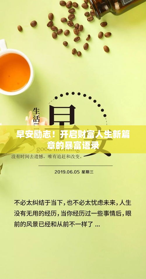 新的一天已经开始,让我们以积极的心态去迎接每一个清晨,让我们用励志暴富语录图片来激励自己,勇敢追求梦想,相信自己,坚持不懈地努力,我们一定能够创造属于自己的财富传奇,早安,朋友们!让我们一起开启财富人生新篇章!