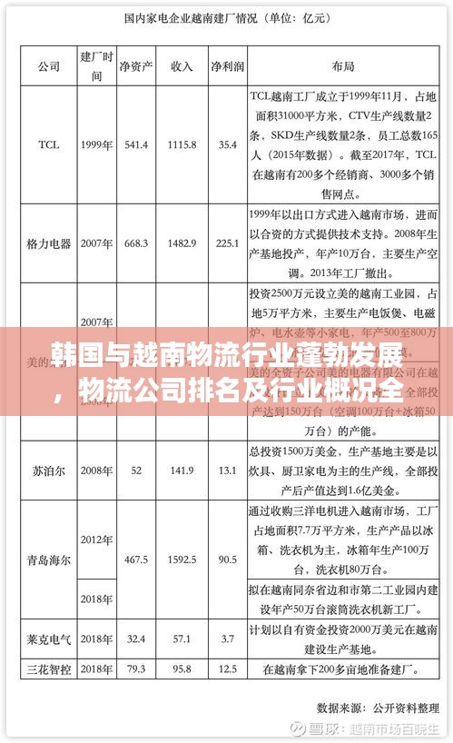 韩国和越南的物流行业在两国贸易往来的推动下获得了长足的发展,本文介绍了两国物流公司的排名及合作情况,以期为读者提供一个关于两国物流行业概况的全面了解,随着全球经济一体化的深入发展,两国物流行业的合作前景将更加广阔。
