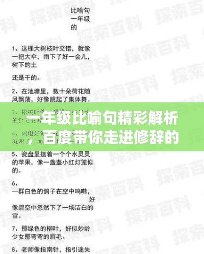 在一年级的学习生活中,孩子们开始接触并学习各种语言表达方式,其中比喻句是一种非常有趣且富有想象力的语言形式,什么是比喻句呢?让我们一起来百度一下,探索一年级比喻句的奥秘。