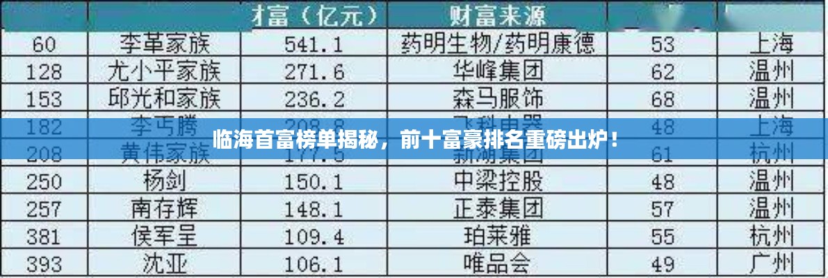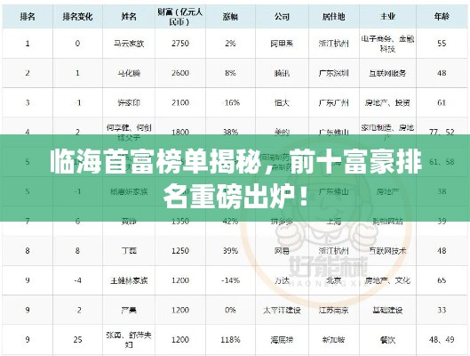 在临海的首富榜单中,前十名富豪均来自不同的行业领域,涵盖了制造业、房地产、电子商务等多个产业,这些富豪凭借敏锐的市场洞察力和卓越的领导能力,在竞争激烈的市场中脱颖而出,成为了临海经济的佼佼者。