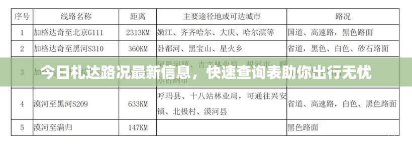 4、天气情况:天气状况对路况具有重要影响,查询表中通常会包含当地的天气情况,以便大家做好出行准备。