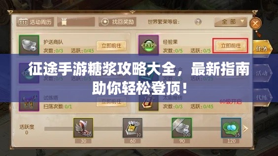 随着手游市场的日益繁荣,各种类型的手游如雨后春笋般涌现,征途手游以其独特的游戏设定和丰富的玩法深受玩家喜爱,在游戏中,糖浆系统是一个重要的组成部分,不仅能为角色提供属性加成,还是游戏中不可或缺的资源,本文将为大家带来最新的征途手游糖浆攻略,帮助玩家更好地掌握游戏技巧,提升游戏体验。