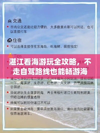 湛江,这座美丽的滨海城市,以其独特的魅力吸引着无数游客,这里的海水清澈、沙滩细腻,让人流连忘返,对于想要欣赏湛江美景的游客来说,非自驾的方式同样可以轻松畅游。