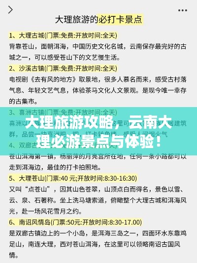 云南,这片美丽的土地,以其独特的自然风光和丰富的民族文化吸引着无数游客,作为云南的知名旅游城市,大理以其秀美的苍山洱海、古老的城墙和独特的白族文化著称,以下是一份精心准备的大理旅游攻略,希望为您的旅行提供有益的参考。