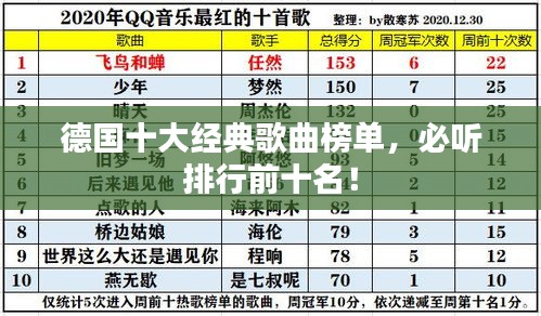 音乐是跨越国界的语言,德国的音乐文化在全球范围内也享有盛誉,本文为您带来德国最强歌曲排名前十名,这些歌曲各具特色,无论是旋律、歌词还是情感表达,都堪称经典。