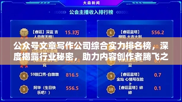 随着数字营销的快速发展,公众号文章写作行业逐渐崭露头角,越来越多的企业和个人开始重视公众号内容的创作与推广,本文将介绍几家在公众号文章写作领域的优秀公司,并对其进行排名,旨在帮助内容创作者找到值得信赖的合作伙伴。