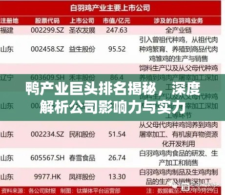 随着全球经济的发展和人民生活水平的提高,鸭产业在全球范围内逐渐崭露头角,本文将探讨鸭产业公司的排名及其影响力,分析这些公司在市场中的地位以及它们对整个鸭产业的影响。