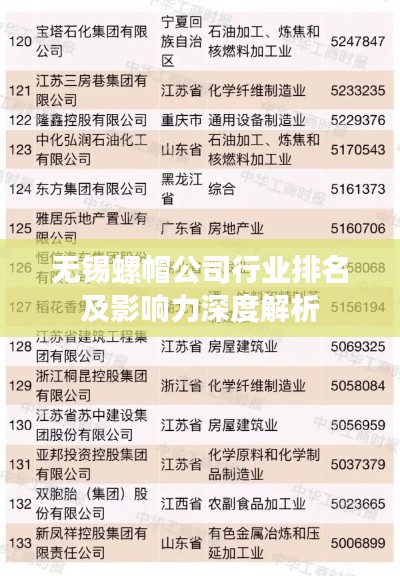 在机械制造业中,螺帽作为关键零部件之一,其质量和供应稳定性对于企业的生产运营至关重要,无锡市作为中国重要的机械制造业基地,拥有众多螺帽生产及供应企业,本文将探讨无锡螺帽公司的排名及其行业影响力。