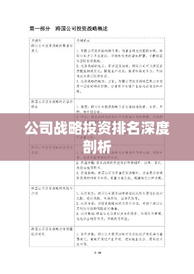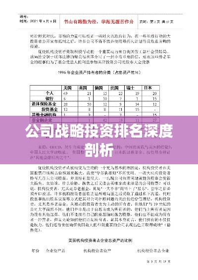 在当今竞争激烈的商业环境中,公司战投排名成为了评估企业综合实力、市场份额及未来发展潜力的重要指标之一,战投,即战略投资者,他们的投资行为不仅为企业提供资金支持,更带来战略协同、资源整合等多方面的优势,本文将围绕公司战投排名这一主题展开,探讨其背后的意义、影响因素以及如何提升排名。