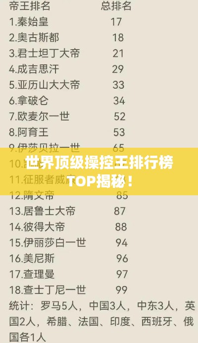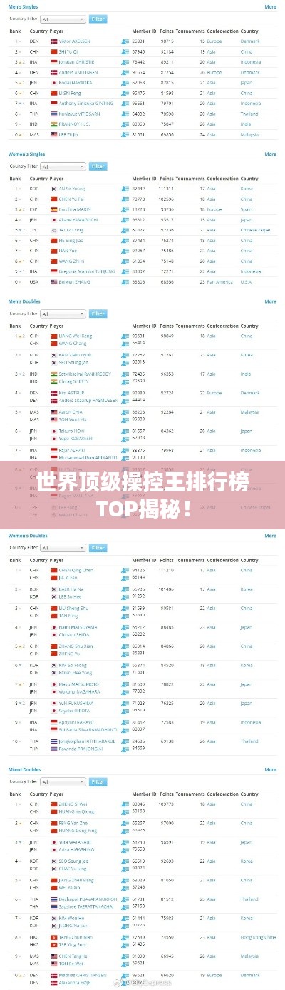 随着科技的飞速发展和电子竞技的崛起,操控技术已成为现代竞技领域中不可或缺的核心技能,在众多电竞项目中,那些掌握顶尖操控技术的选手脱颖而出,被誉为操控王,本文将为您揭示世界顶级操控王的排名。