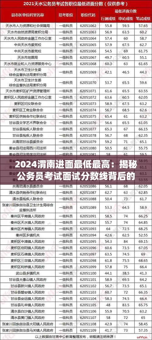 随着公务员考试的日益激烈,面试分数线成为了考生们关注的焦点,本文将深入探讨2024渭南公务员面试的最低与最高分数线的背后故事,同时提供考生在备考过程中的应对策略。