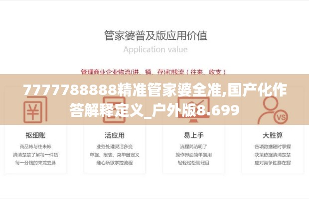 在全球化的浪潮中,澳门特别行政区也不断探索适合自身发展的路径。近期,澳门特别行政区推出了一项名为“7777788888精准管家婆全准”的新型政策文件。这不仅是对国产化作答解释定义的一次尝试,更是澳门政策解锁户外活动新领域的重要举措。《7777788888精准管家婆全准,国产化作答解释定义_户外版8.699》文件,作为澳门政策文件中的又一力作,旨在通过具体的策略和措施,推动澳门的走出去,强化其特色产业在国内外市场的竞争力。