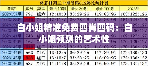 现代社会,信息爆炸,人们对于迅速获得准确信息的要求愈发迫切。在这样的背景下,预测技术应运而生,给人们提供宝贵的数据参考。在众多预测技术中,“白小姐精准免费四肖四码”以其独特的魅力和卓越的准确率,受到了广泛关注和赞誉。其预测艺术性不仅令人赞叹,更承载了深厚的文化价值和研究参考意义。本文旨在探讨“白小姐精准免费四肖四码:白小姐预测的艺术性”,以期为读者提供一些有益的思考和认识。