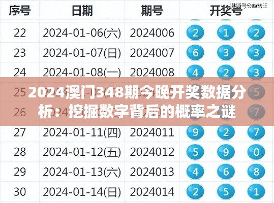 澳门博彩市场一直是亚洲乃至全球博彩业的焦点。随着2024年澳门第348期开奖临近,关注者和参赛者都在密切地分析每一年的投赌趋势,试图从数据中寻找规律和概率。本文将对2024年澳门348期今晚开奖的数据分析进行深入探讨,挖掘数字背后的奥妙,为企业和参与者提供策略参考。