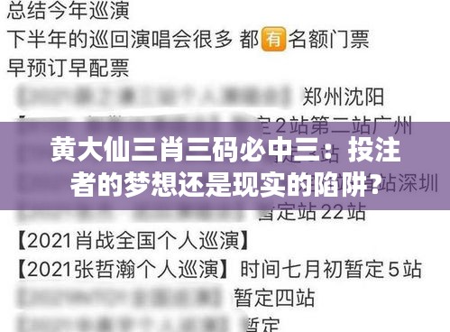 在澳门博彩业中,一种名为“黄大仙三肖三码必中三”的游戏受到了许多投注者的追捧。这个游戏声称能够确保投注者在每轮投注中都能获得胜利,听起来仿佛是实现梦想的最佳途径。然而,这个所谓的“必胜”策略真的能让投注者笑到最后,还是只是一个布置精巧的陷阱呢?本文将深入探讨这个问题。