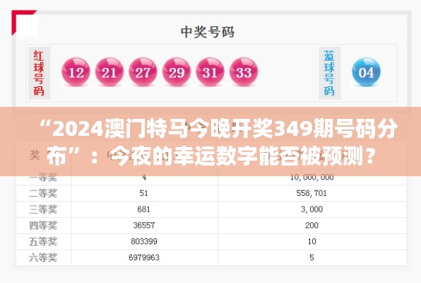 2024年澳门特码彩票,作为澳门博彩业的重要组成部分,其开奖结果备受广大彩民朋友的关注。特别是在第349期的开奖前夕,众多彩民朋友纷纷探讨今夜幸运数字的可能性预测。那么,今夜的幸运数字能否被预测呢?就此问题,本文旨在对特码彩票开奖的号码分布进行深入分析,同时探讨其能否被预测的可能性,以供广大彩民朋友参考。