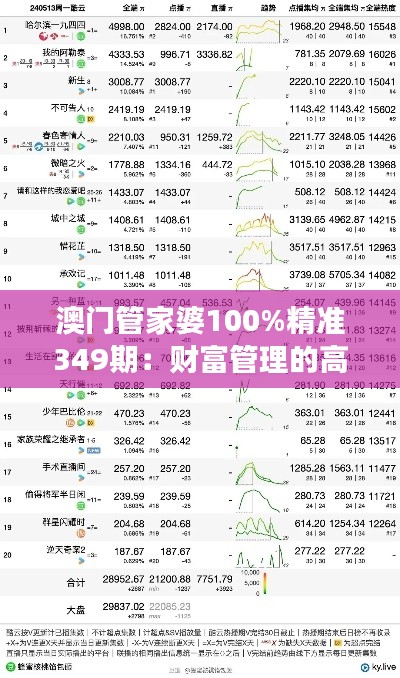在这个快速发展、充满变化的时代,澳门作为一个国际化的城市,越来越多地汇聚着全球各地富有智慧的财富人士。澳门管家婆作为一个专业且深受信赖的财经信息和服务品牌,为澳门钱庄、金融管理者,以及投资者们提供了一个智慧平台上的各种数据应用、财富咨询和理财问题解答交流,能够帮助他们制定出更加精准有效的财富管理策略。特别是在第349期中,澳门管家婆100%精准349期:财富管理的高明策略给出了一系列实施方案,这些策略能够帮助澳门的金融界人士更好地引导投资者走向财富增长之路。