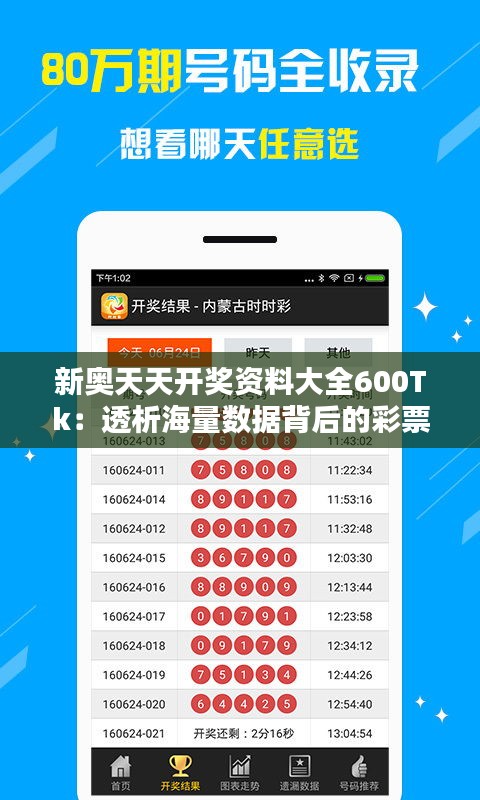 彩票作为一种流行的娱乐方式,其背后的复杂性和中奖的随机性一直是公众关注的焦点。新奥天天开奖资料大全600Tk作为一个全面、权威的平台,提供了海量的彩票开奖数据和分析,让彩票爱好者能够更好地理解彩票中奖的学问。本文将带你走进这个平台,深入了解其背后的海量数据以及如何透析这些数据来提高中奖几率。