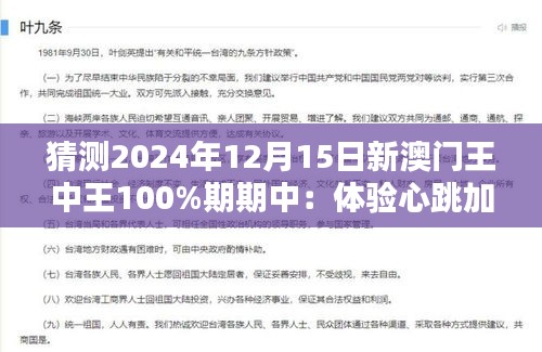 澳门,这座东方的拉斯维加斯以其独特的魅力和盛大的赛事吸引着全球的目光。2024年,新澳门王中王赛事更是独树一帜,成为国际关注的焦点。“猜测2024年12月15日新澳门王中王100%期期中:体验心跳加速的顶尖对决”就是在这样的背景下诞生的。这篇文章将带您一窥赛事的神秘面纱,让您提前感受那心跳加速的紧绷氛围。