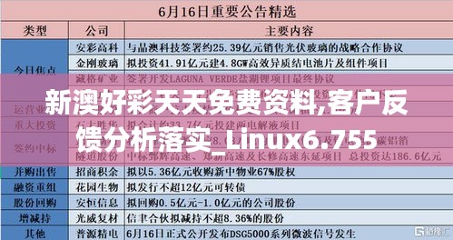 “新澳好彩天天免费资料”指的是澳门政府为企业提供的一系列免费政策文件和业务指南。这些资料覆盖税收、金融、贸易等多个领域,为企业提供全面的指引。在"Linux6.755"系统的支持下,这些资料能够稳定、快速地传输给企业,并保证在信息传递过程中的安全性和完整性。企业和个人可以通过访问该系统获取最新的政策变更、市场动态,及时调整其业务策略和计划。