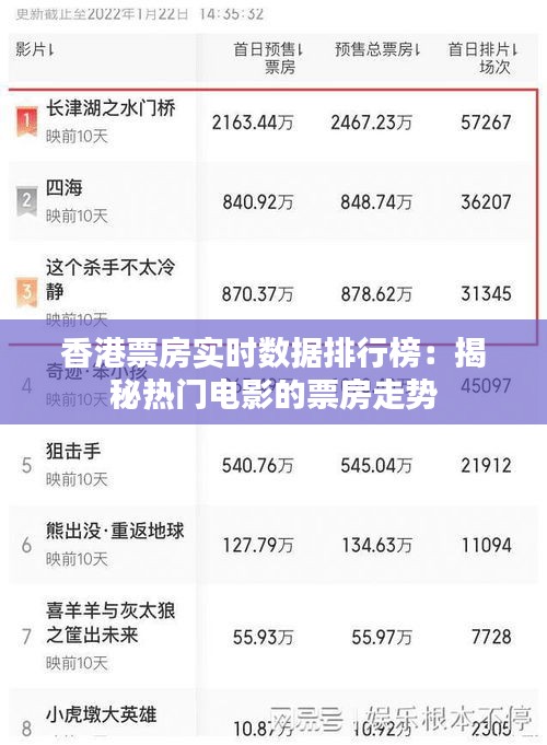 总之,香港票房实时数据排行榜是了解电影市场动态的重要工具。通过分析热门电影的票房走势,我们可以更好地把握市场脉搏,为电影产业的发展提供有力支持。