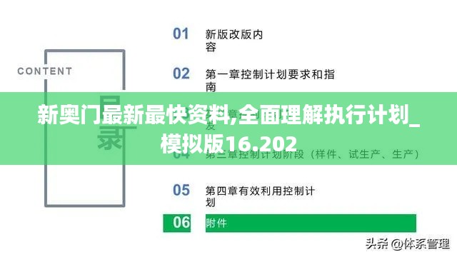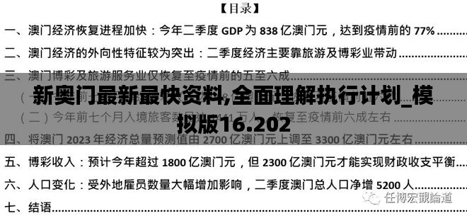 随着信息时代的到来,快速获取资讯已经成为全球发展的重要一环。尤其是澳门这个国际化大都市,更需要紧跟时代的步伐。而近期发布的《新奥门最新最快资料,全面理解执行计划_模拟版16.202》(以下简称《模拟版16.202》),为我们提供了一个绝佳的视角,深入了解澳门政策的最新动态。