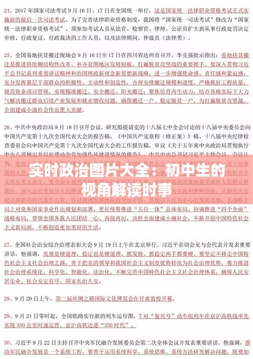 实时政治图片是初中生了解时事、学习知识的重要途径。通过欣赏和分析这些图片,初中生可以拓宽视野,增长见识,培养自己的社会责任感和使命感。在今后的学习和生活中,让我们继续关注时事,用图片记录时代,用知识改变未来。